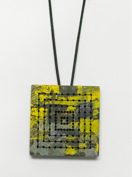 Discover the beauty of handcrafted design with this striking long necklace in yellow, grey, and black. Each piece is thoughtfully made from wood, yarn, and leather, blending natural textures with a modern, distressed aesthetic.